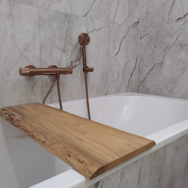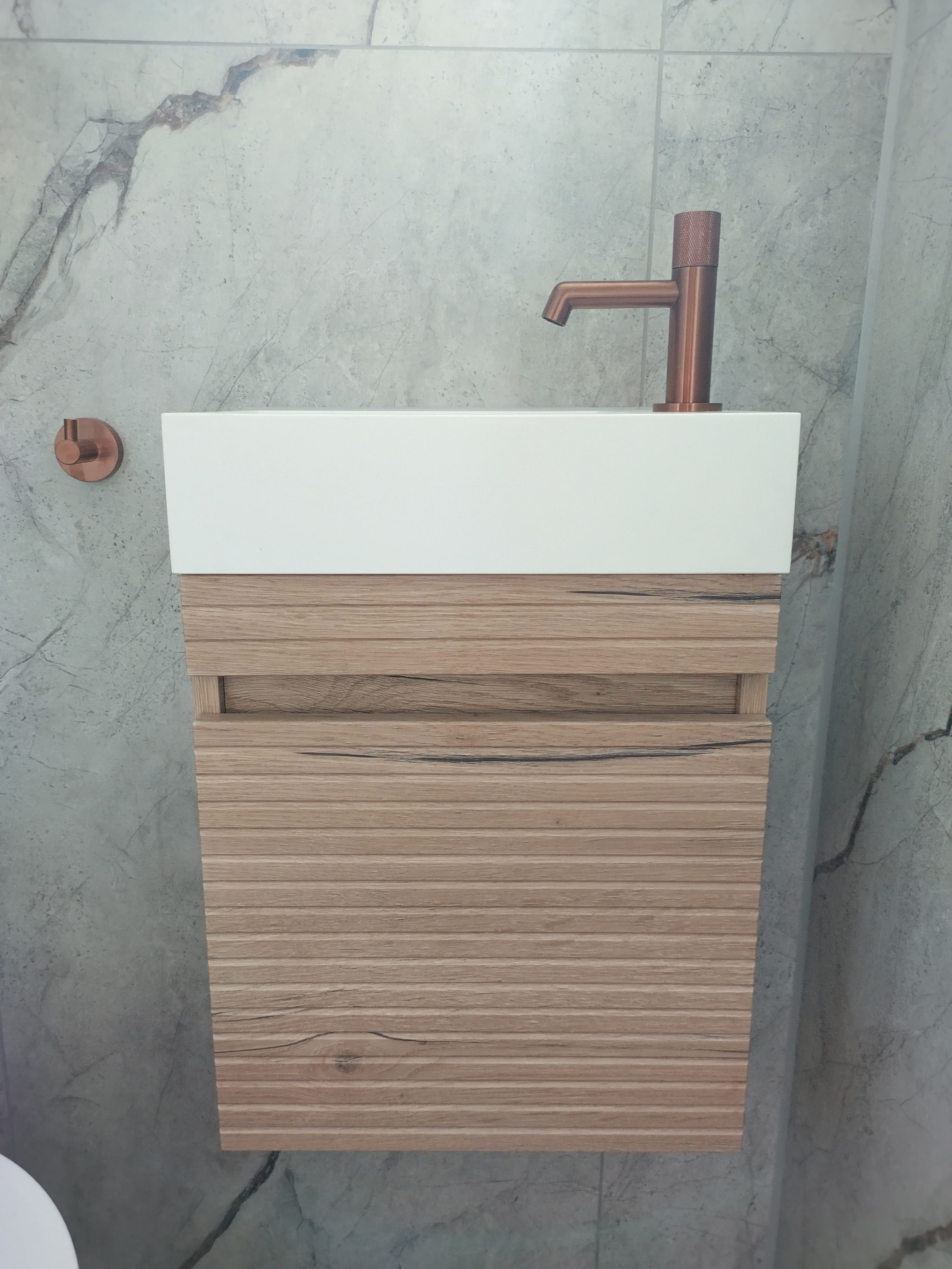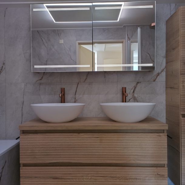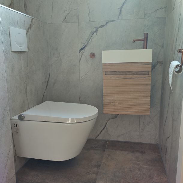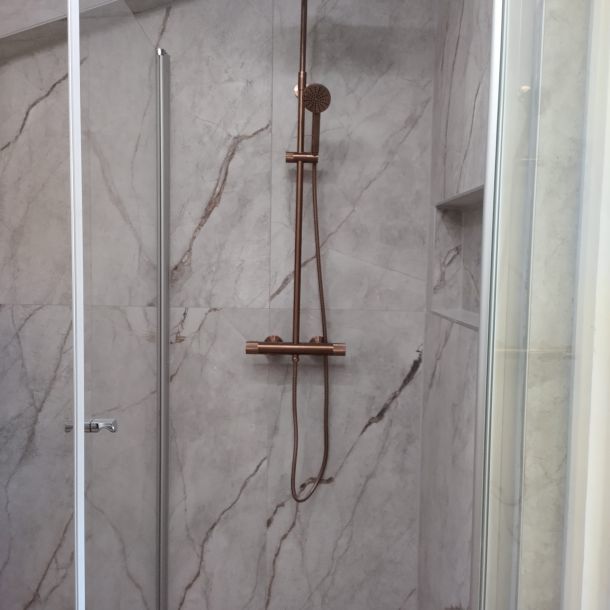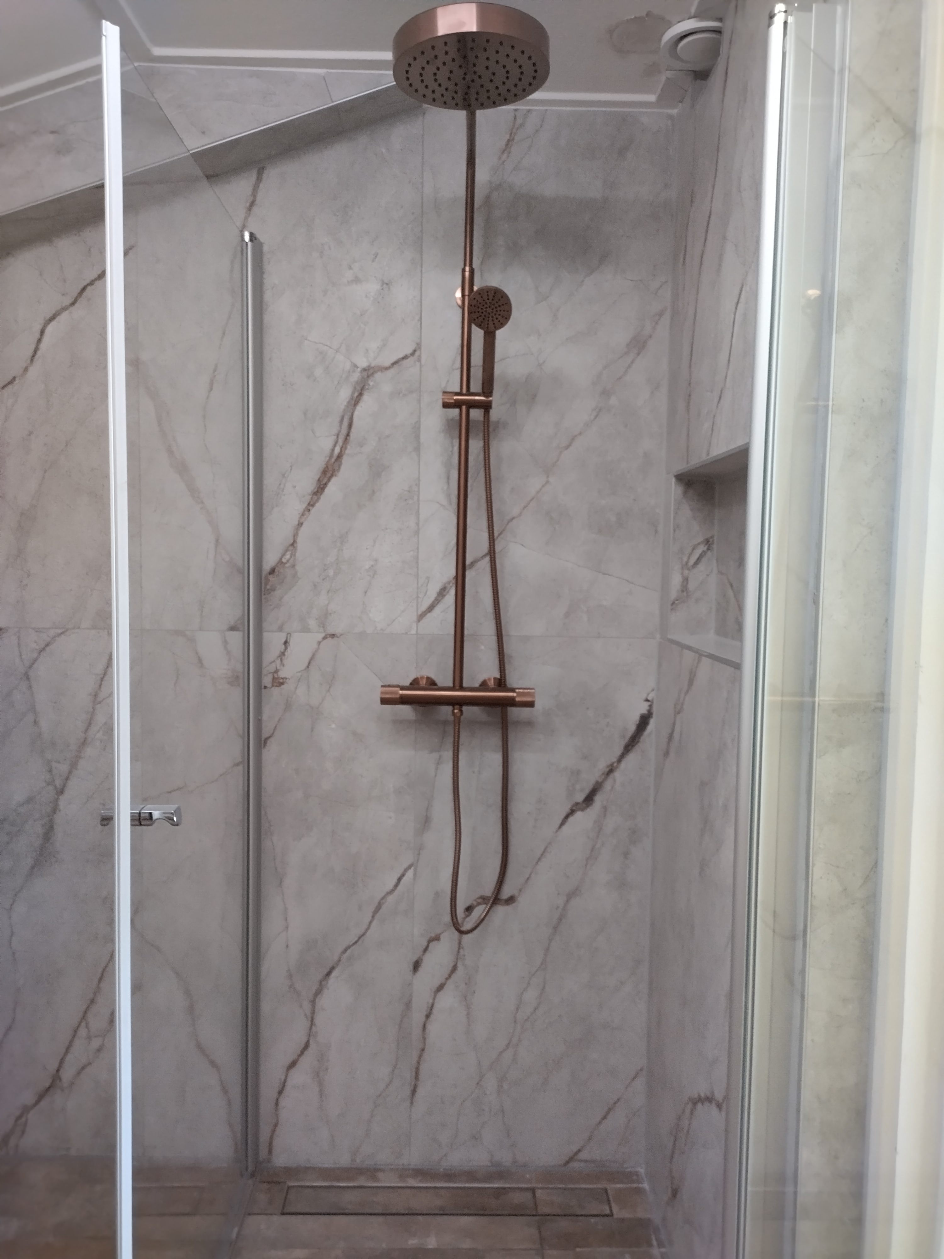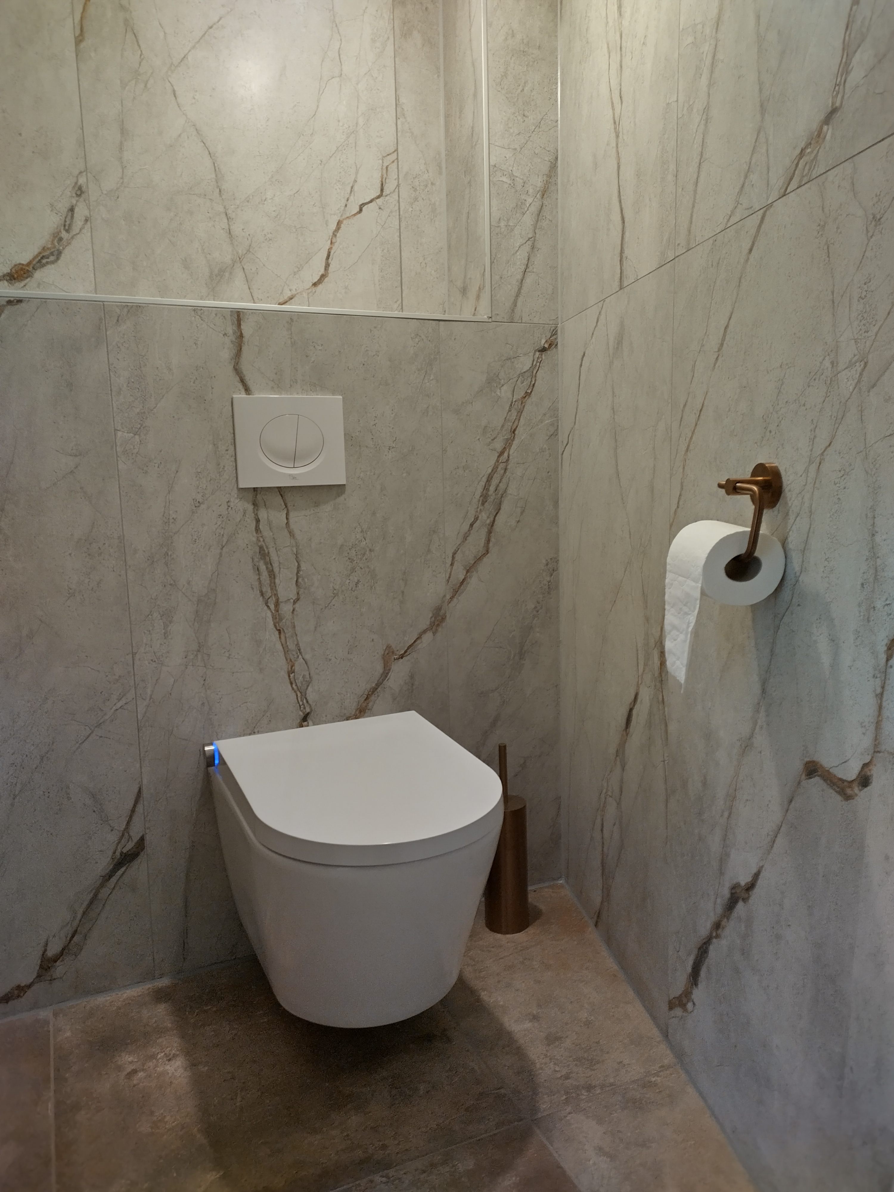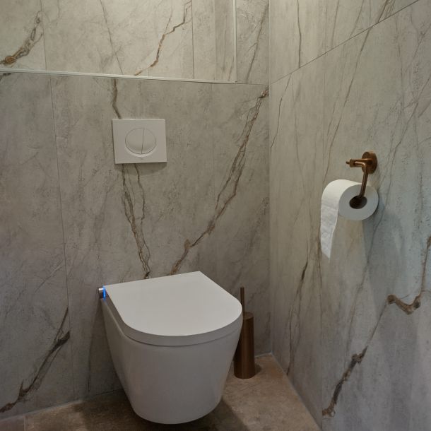 In deze badkamerverbouwing waar de toiletten niet in de badkamer geplaatst zijn is weer gebruik gemaakt van de grootformaat wandtegels. Deze marmer-look wandtegels van 120x60 zijn in de hoogte geplaatst waardoor de badkamer hoger lijkt.