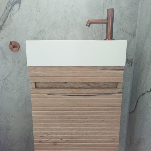 In de badkamer zijn het ligbad, wastafelmeubel en douchecabine geplaatst. Aan het plafond is een infrarood warmtepaneel met verlichting geplaatst.