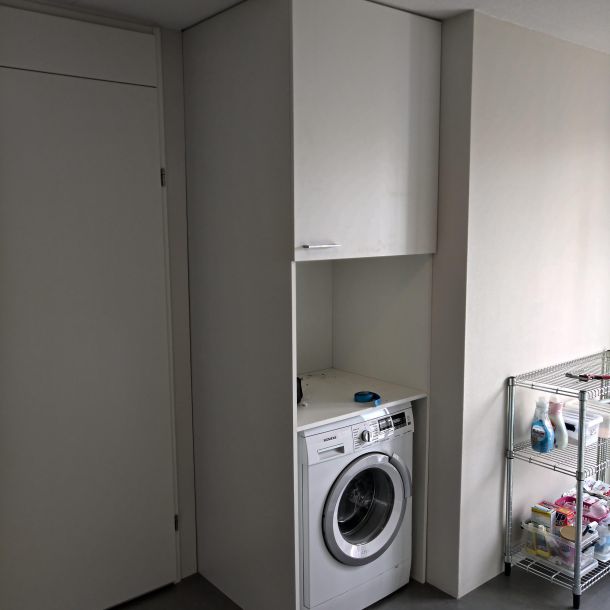 De wasmachine heeft een grote ombouw gekregen met ruime bovenkast.
