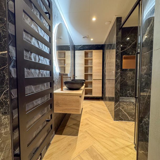 Ben je op zoek naar een moderne en luxe badkamer die perfect aansluit bij jouw woonstijl? Deze badkamer is ontworpen voor particulieren die kiezen voor kwaliteit, comfort en een tijdloze uitstraling. Met een combinatie van zwart marmer, matzwarte waskommen, koperkleurige kranen en warme houtaccenten ontstaat een ruimte die elke dag voelt als een wellnessmoment.