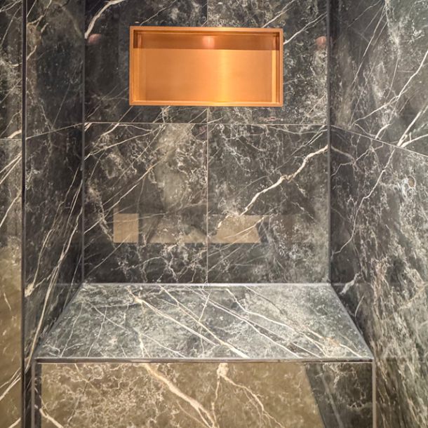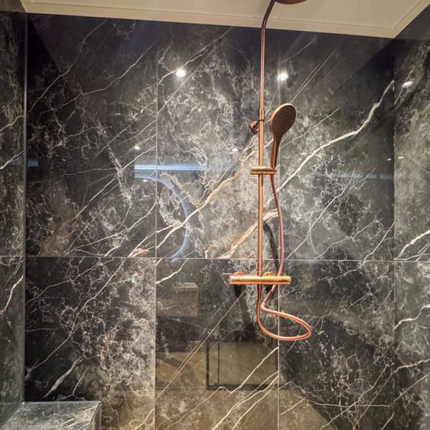 • Luxe materialen zoals zwart marmer met witte aders